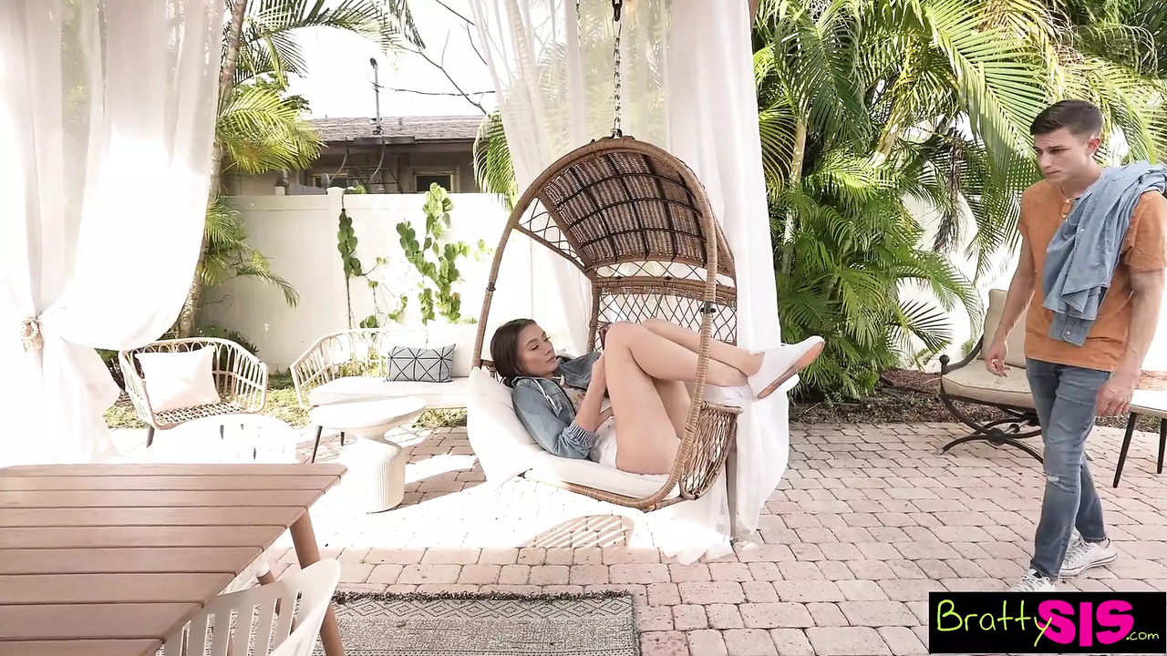 Sultry stepsister in a short skirt and high heels seductively offers her ass to her unsuspecting brother. He can't resist her charm and takes her from behind, pumping hard until he cums all over her soaking body.