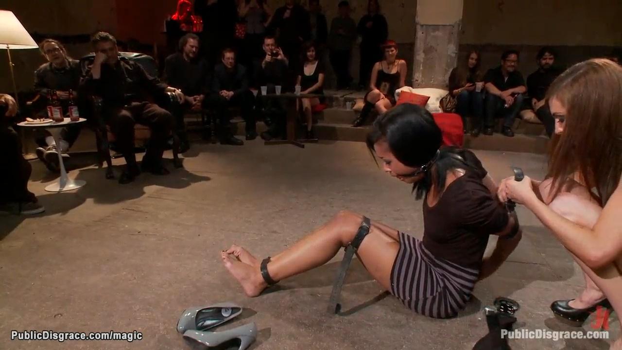 Skin Diamond, the tanned brunette slave, is tied up and gagged on the ground in a public place. Her knees are bound to a spreader bar as massive cocked James Deen and other strangers take turns anally pounding her. She suffers through the anal gang banging in front of an audience.