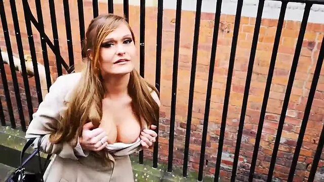 A naughty British girl walks down the street confidently and suddenly exposes her large, perky breasts to a crowd of unsuspecting onlookers. She turns around and gives them a full view of her bare chest, causing quite the commotion. The crowd gasps and cheers as she proudly flaunts her body.