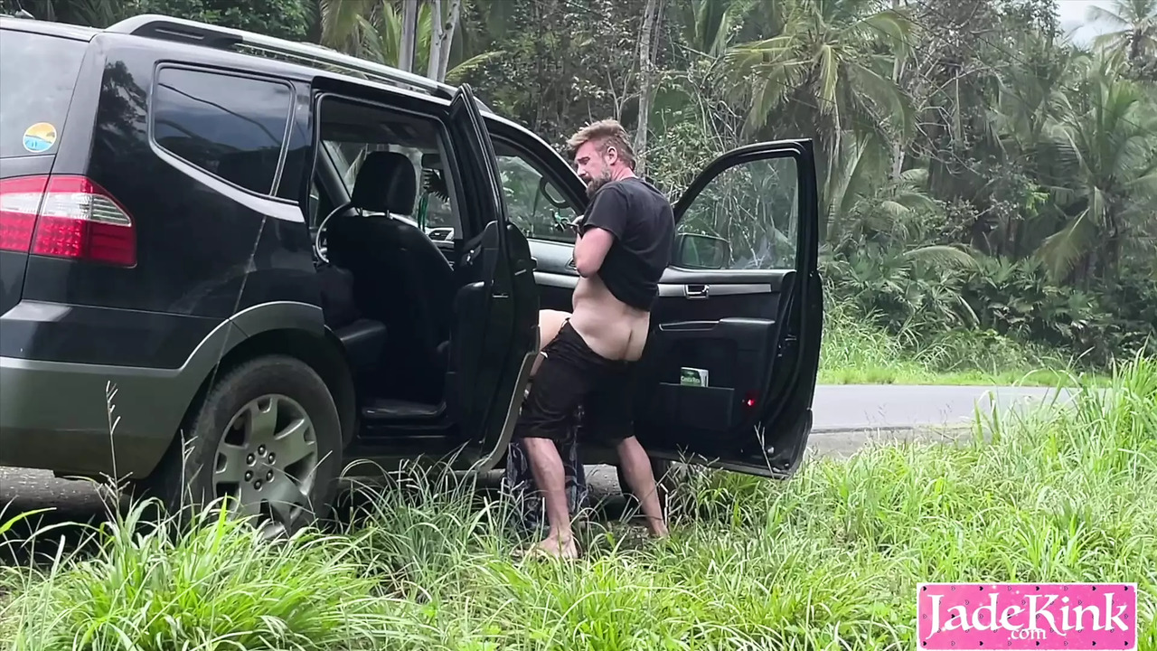 A kinky couple engages in a risky public fuck on the side of the road. The submissive blonde slut gets her perfect cock hard and deep while in doggystyle position. He blows his load on her face, and she eagerly licks it up, her blue eyes filled with lust.