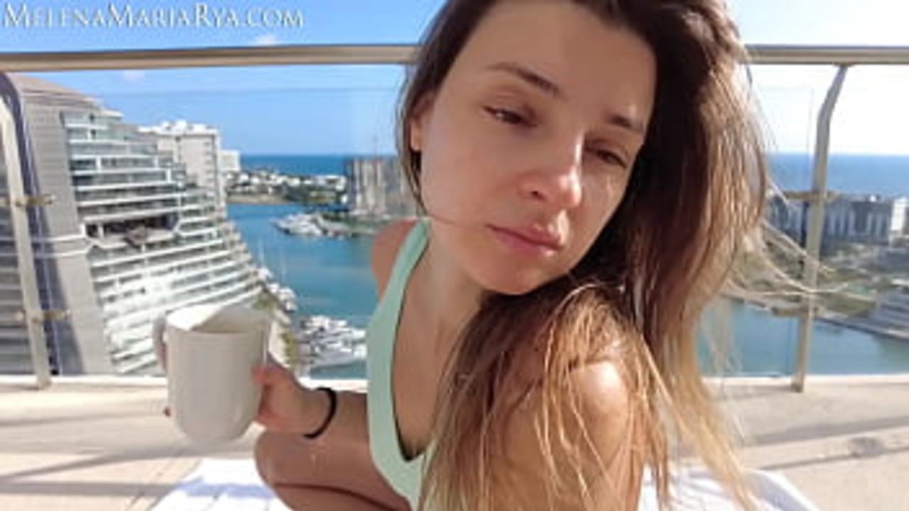 A stunning brunette in gym clothes exercises on her balcony, her huge natural tits bouncing as she moves. She lifts weights and stretches, showing off her tight ass. It's a sexy solo workout session with plenty of eye candy.